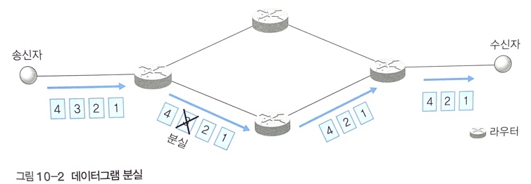 - 송신 프로세스가 전송한 데이터그램 4개가 첫 라우터에서 두 번째 라우터로 전송되는 과정에서 3번 데이터그램에 오류가 발생해 다음 라우터에 도착하지 못했다.