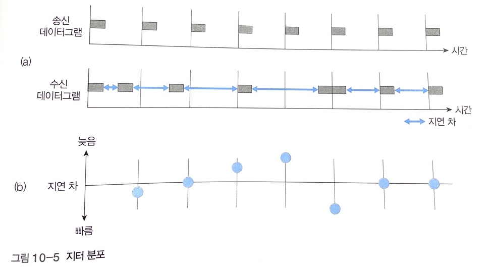 - 지터 분포 : 데이터그램의 도착 시간을 측정하였을 때 각 데이터그램의 도착 시간이 일정하지 않고 불규칙적으로 도착하는 정도