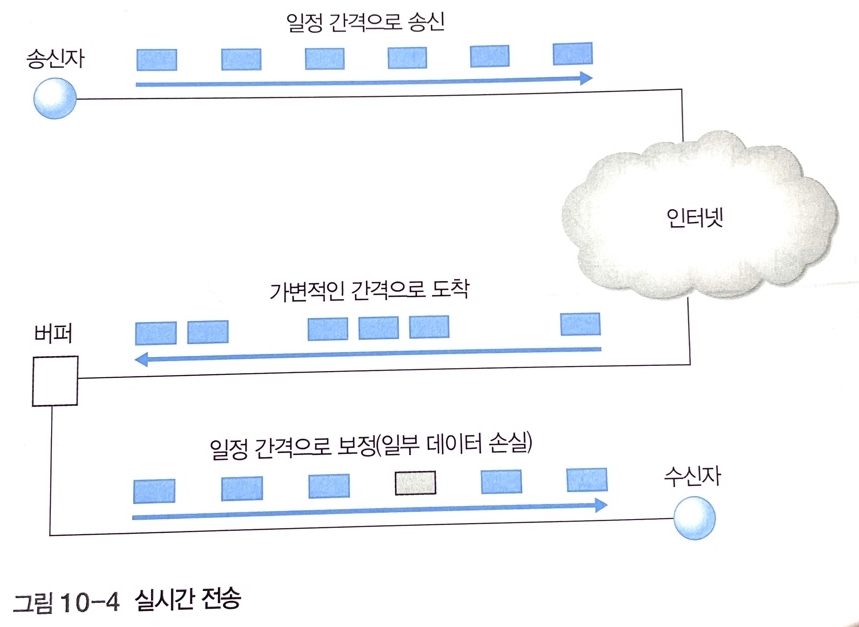 - 실시간 서비스는 전송 시간이 중요하고 송신 프로세스가 전송한 데이터의 전송 간격이 수신 프로세스에 그대로 유지되도록 하는 것이 중요하며, 대부분 특정 데이터가 정해진 시간 안에 반드시 도착하도록 요구한다.