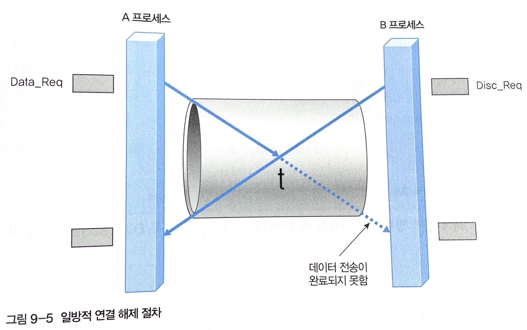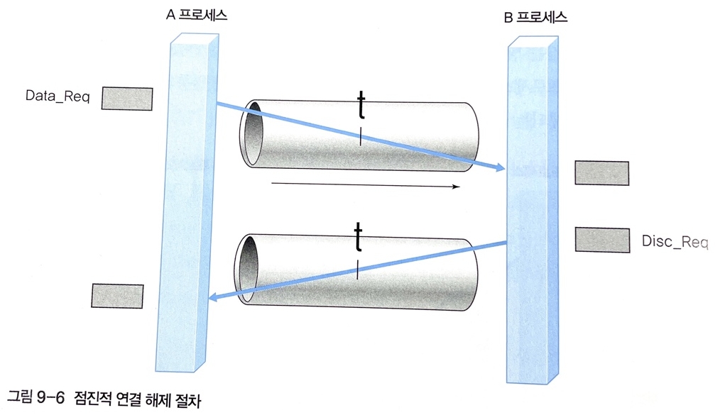 - 점진적 연결 해제 절차로 하나의 연결에 두 개의 단방향 연결을 지원하는 원통이 존재하는 것과 같다. 따라서 A의 데이터 전송 과정 중에 B의 연결 해제 요구가 발생해도 아래쪽 원통 기능만 정지하고, 위쪽 원통은 여전히 정상 기능을 수행(두 프로세스 사이의 연결을 완전히 종료하려면 양쪽에서 자신에게 할당된 단방향의 원통 기능을 명시적으로 정지해야 된다)