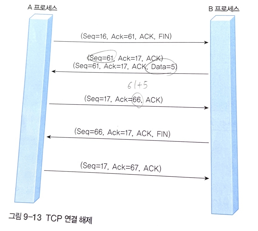 - FIN 플래그가 지정된 세그먼트를 수신한 프로세스는 이에 대한 응답으로 순서 번호를 1 증가시켜서 응답 번호를 17번으로 지정한 긍정 응답 세그먼트를 회신했고 자신이 전송할 61번 세그먼트 이후의 데이터는 계속 전송하고 있다. 5바이트의 데이터를 전송한 후에 FIN 플래그를 사용해 연결 종료하는 것으로 합의하고 있다.