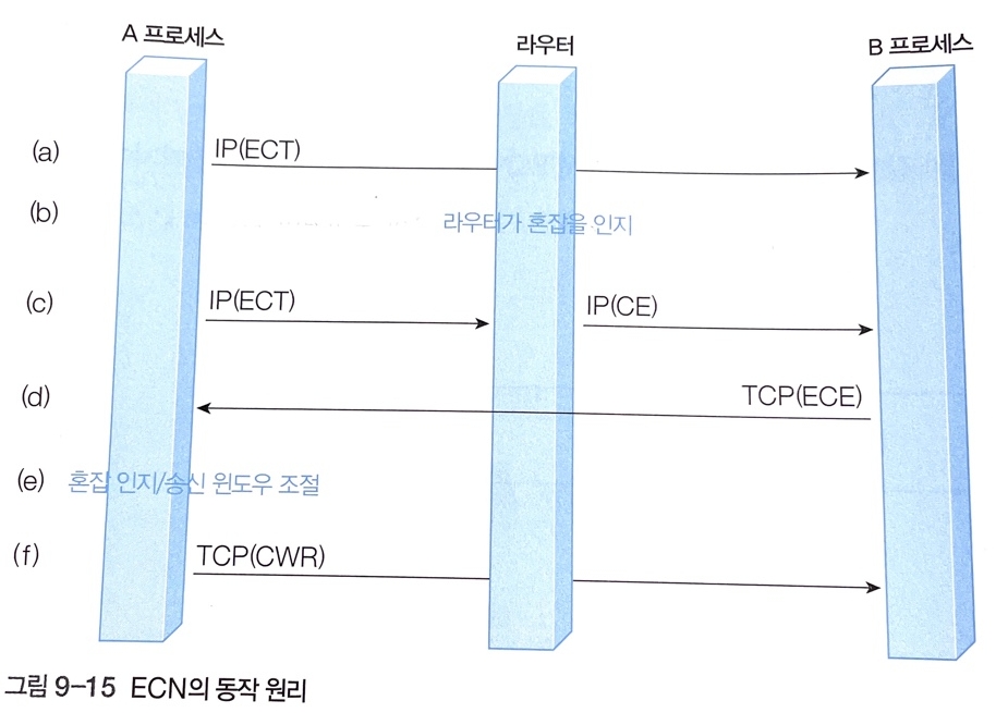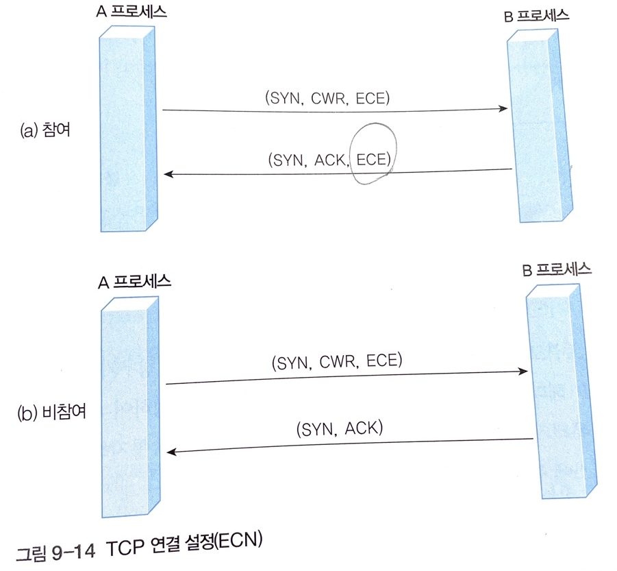 - 최근에 TCP에 ECN 기능은 라우터가 송신 프로세스에 명시적으로 혼잡 발생을 알려주어 송신 프로세스 스스로 트래픽을 완화하는 기술이다. TCP는 ECN 기능을 지원하기 위해 CWR필드와 ECE 필드를 정의한다.