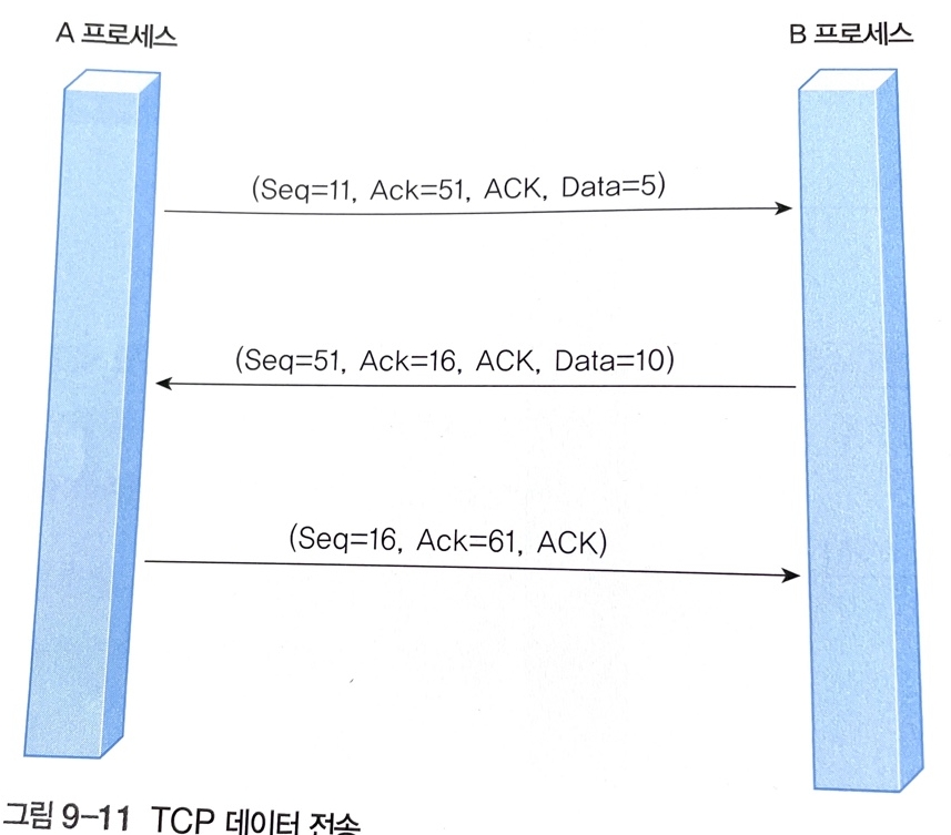 -> 세그먼트 세 개가 순차적으로 전송되는 경우로 A가 먼저 순서 번호 11부터 5바이트의 데이터를 전송하고, B는 순서 번호 51번부터 10 바이트의 데이터를 전송한다. 순서 번호와 응답 번호의 조합은 전송되는 데이터의 양에 따라 적절히 조정되고 있다.