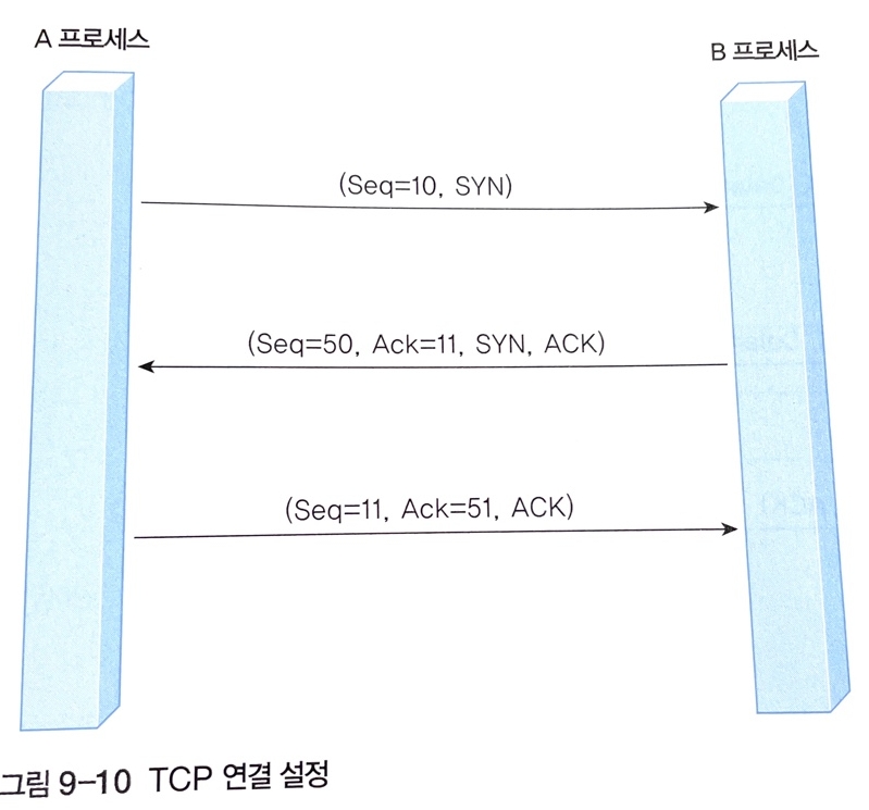 : TCP를 사용하는 프로세스가 가장 먼저 실행하는 3단계 설정 방식(Three-way Handshake)으로 A프로세스가 연결 설정을 요구하고 B프로세스가 이를 수락하는 형식이다.