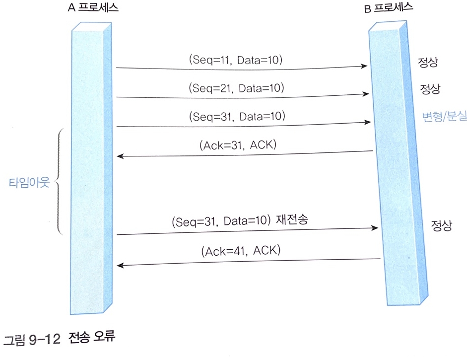- TCP는 부정 응답 기능인 NAK를 사용하지 않아서 수신 프로세스에 도착한 데이터 세그먼트의 내용이 변형되어도 수신 프로세스가 응답을 하지 않아 데이터 분실과 동일하게 처리된다. 데이터 변형과 분실 오류가 발생하면, 수신 프로세스로부터 회신을 받을 수 없으므로 송신 프로세스의 타임아웃 기능에 의해 오류가 복구된다.