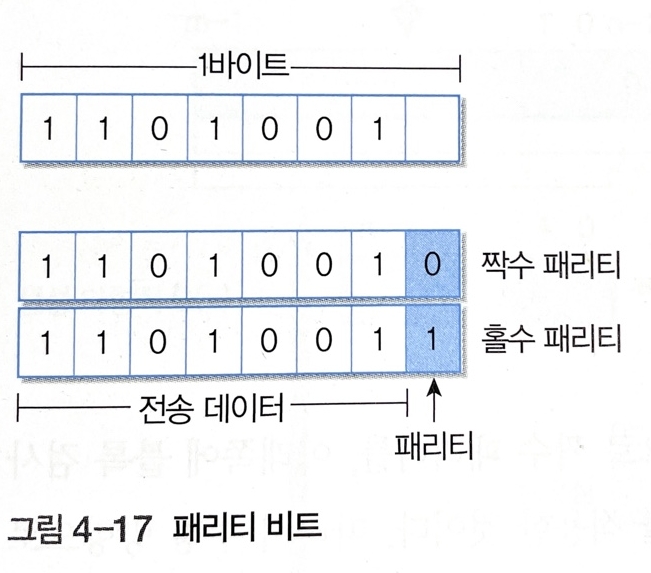 : 1바이트 구조에서 7비트의 아스키코드를 제외한 나머지 1비트로 1의 개수가 짝수냐 홀수 냐에 따라 짝수 패리티, 홀수 패리티가 있다.