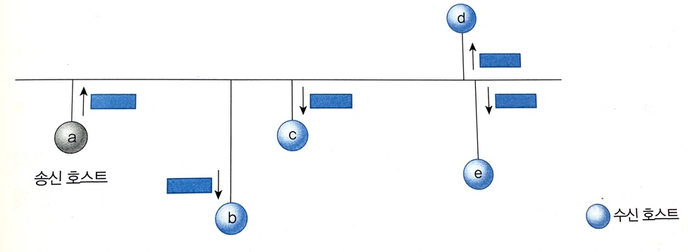 -> a가 전송한 데이터는 네트워크에 연결된 모든 호스트(b, c, d, e)에 전달, 자신과 일치하지 않는 호스트는 데이터를 받지 않는다.
