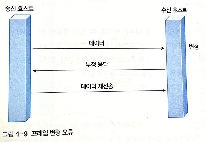 - 오류를 인지한 수신 호스트는 송신 호스트에 부정 응답 프레임을 전송함으로써, 원래의 데이터 프레임을 재전송하는 복구 과정이 진행된다.