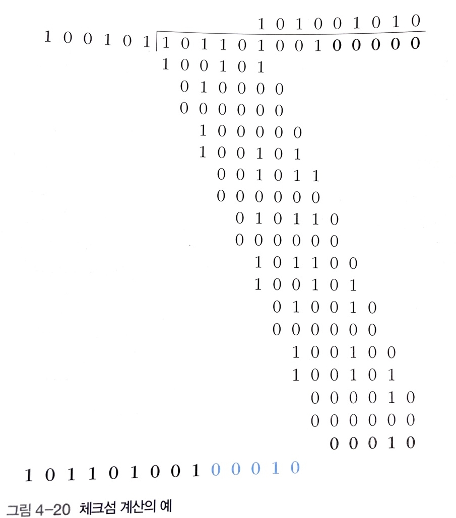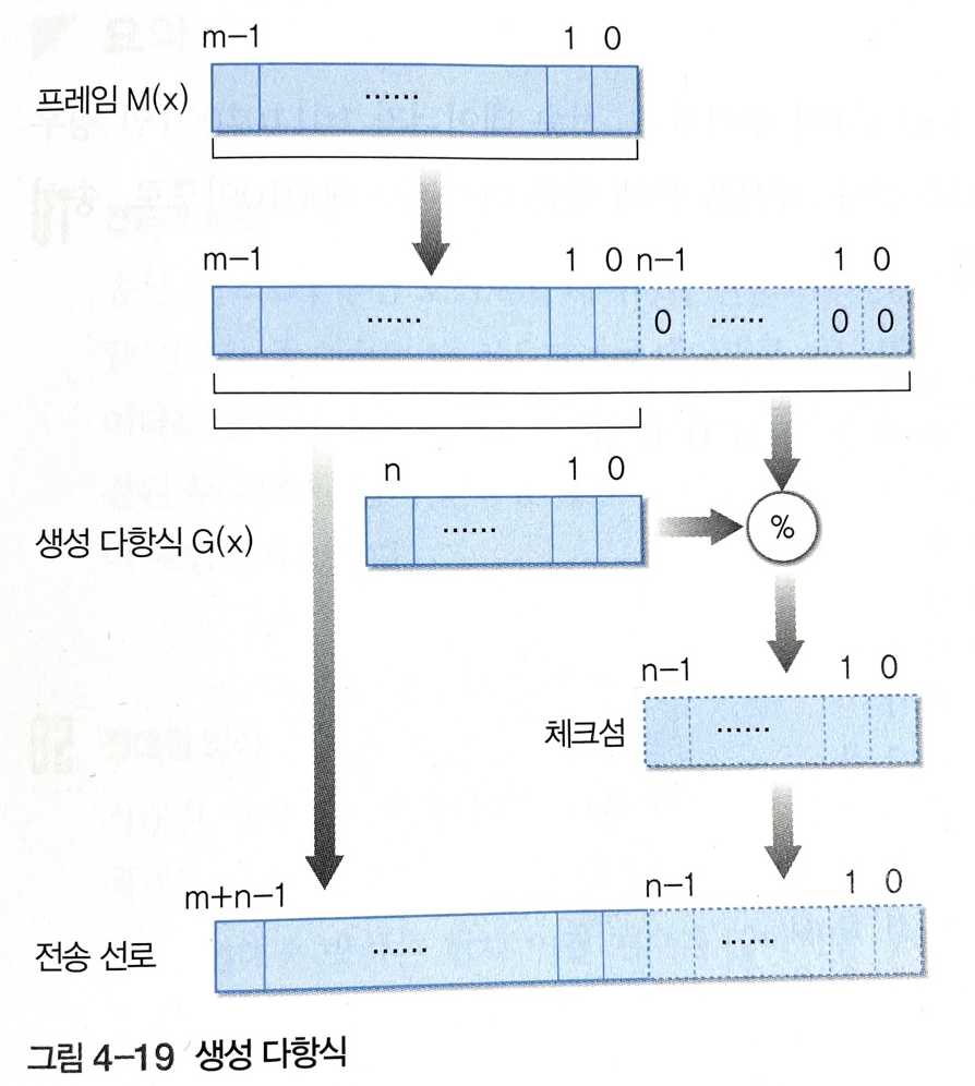 - 수신 호스트는 전송 오류가 발생했는지 판단하기 위해 수신한 m+n비트의 데이터를 생성 다항식 G로 나누는 연산을 수행한다. 결과로 얻은 나머지가 0이면 오류 없음, 아니면 오류 발생