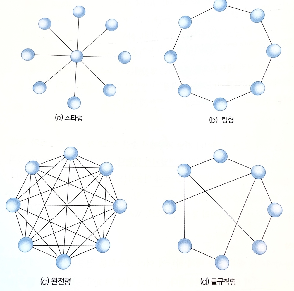 - 전체 연결 개수가 많아지면 성능 면에서 유리하지만 비용이 많이 들고 연결 개수가 적어지면 네트워크 혼잡도가 증가한다. ex) 스타형, 링형, 완전형, 불규칙형