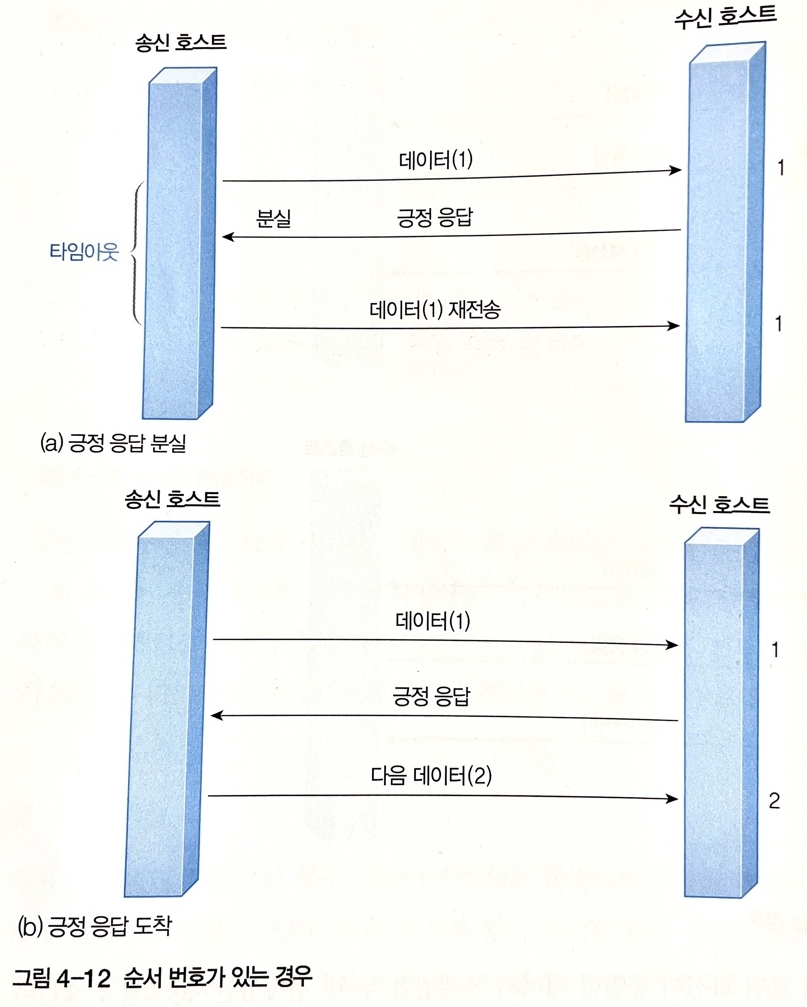 - 수신 호스트가 보낸 긍정 응답 프레임을 분실하면 데이터 프레임이 제대로 도착해도 송신 호스트가 이를 인지할 수 없다. 따라서 송신 호스트가 타임아웃 기능에 의해 원래 프레임을 재전송함으로써 수신 호스트가 데이터 프레임을 중복 수신하는 결과를 초래한다. 이때 중복 프레임을 가려내려면 내부에 순서 번호(Sequence Number)를 기록해야 한다.