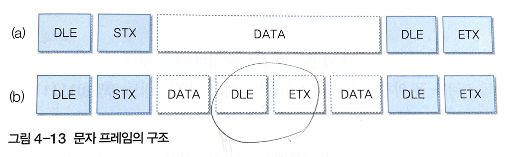 - 하나의 프레임 단위를 구분하기 위해 프레임의 앞뒤에 아스키코드의 특수 문자를 이용한다. 즉, 각 프레임의 시작 위치에 DLE/STX 문자를 추가하고, 끝나는 위치에는 DLE/ETX를 추가해 프레임의 다른 정보와 구분할 수 있도록 한다.