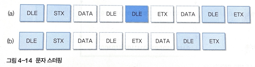 (b)는 이를 설명하고 있으며 이와 같이 문자 프레임의 전송 과정에서 제어 문자를 추가하는 기능을 문자 스터핑(Character Stuffing)이라 한다.