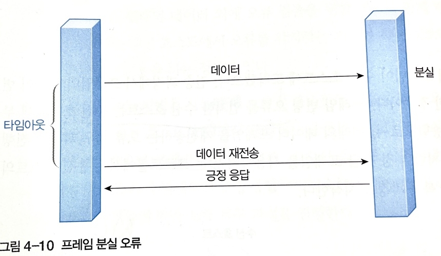 - 송신 호스트가 전송한 데이터 프레임이 수신 호스트에 도착하지 못하는 분실 오류가 발생하면 수신 호스트는 이 사실을 인지할 수 없으므로 복구 과정이 송신 호스트 주도로 이뤄져야 한다. 일정 시간 이내에 수신 호스트로부터 응답 프레임이 없으면 타임아웃 기능(Timeout)을 동작시켜 데이터 프레임을 재전송한다.