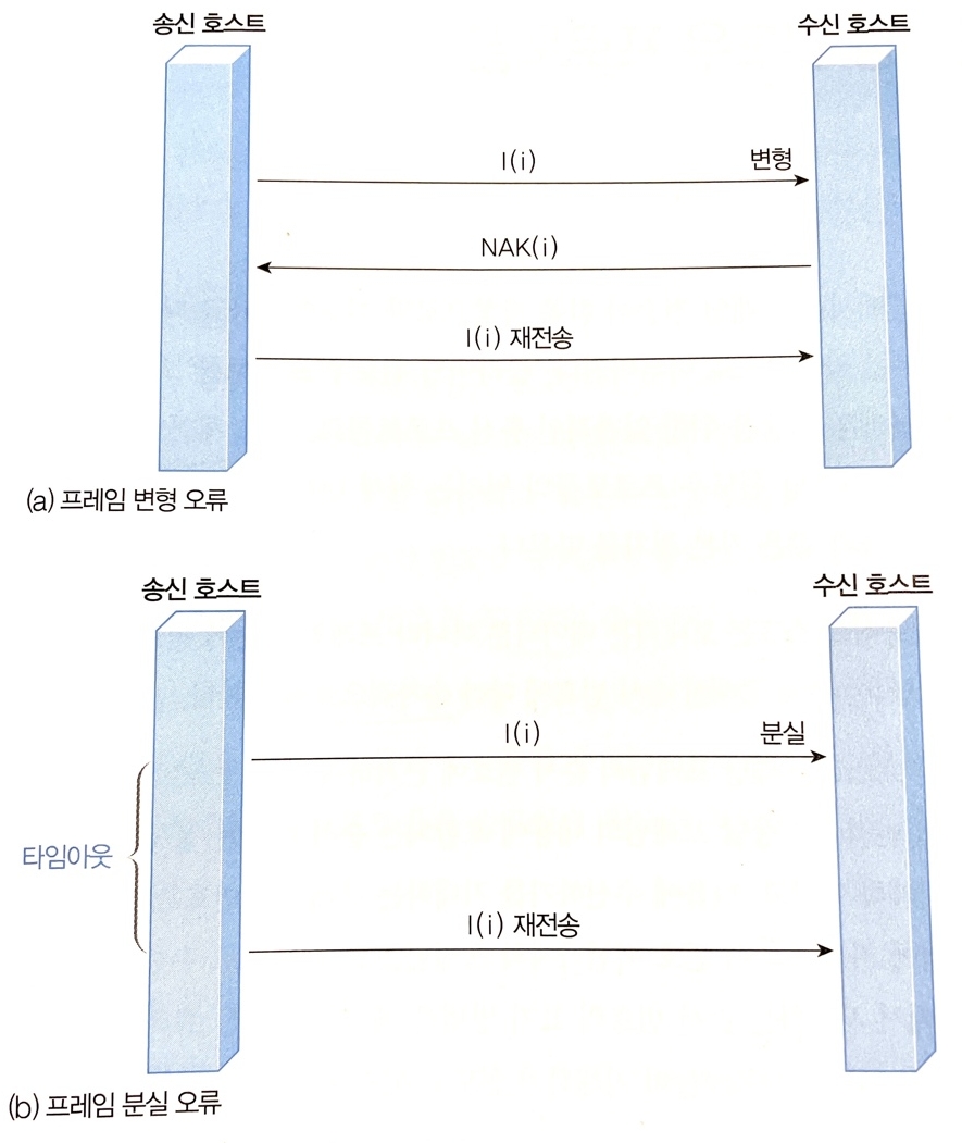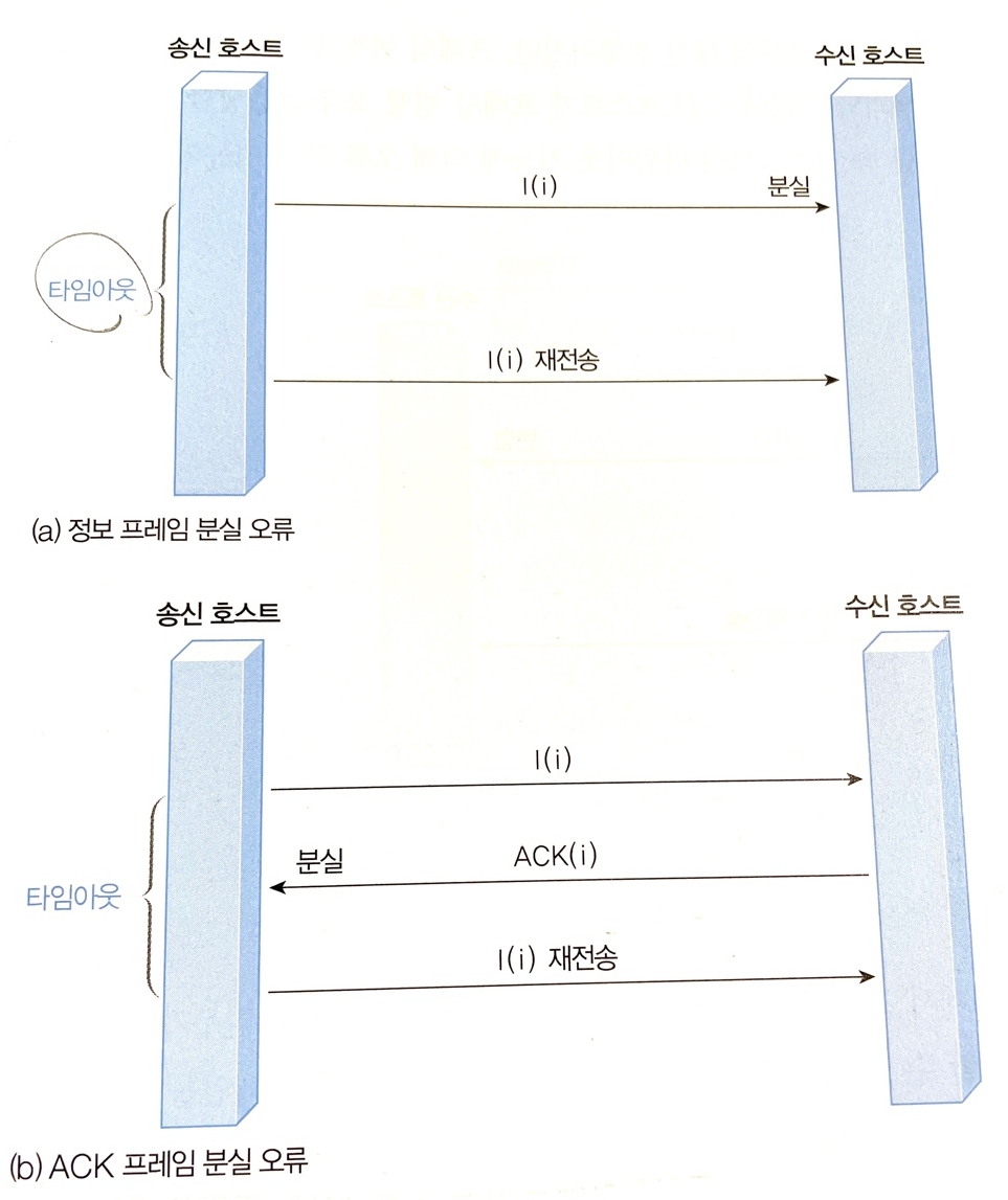 -> (a)는 송신 호스트가 전송한 정보 프레임을 분실한 경우로, 수신 호스트는 받은 것이 없어 ACK를 보낼 수 없고 송신 호스트는 일정 시간을 설정해 재전송한다.