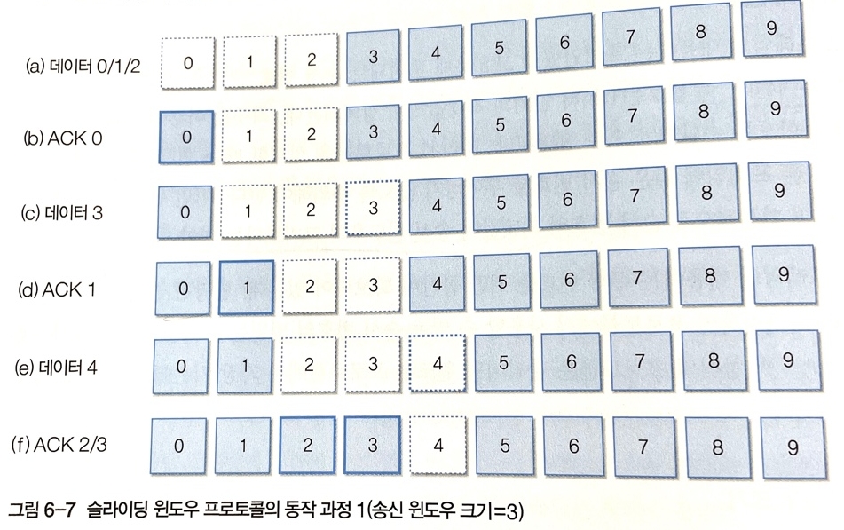- 위 그림처럼 3비트의 순서 번호를 이용한 슬라이딩 윈도우 프로토콜을 사용.