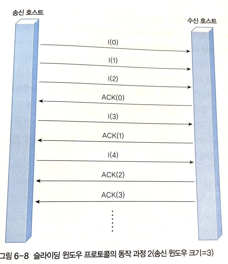 3) 송신 호스트는 송신한 정보 프레임을 자신의 내부 버퍼에 유지하며, 이를 송신 윈도우라 한다. 송신 윈도우에서 대기하는 정보 프레임은 송신 호스트가 수신 호스트에 프레임 전송을 완료했지만 아직 수신 호스트로부터 긍정 응답을 받지 못한 프레임이다.