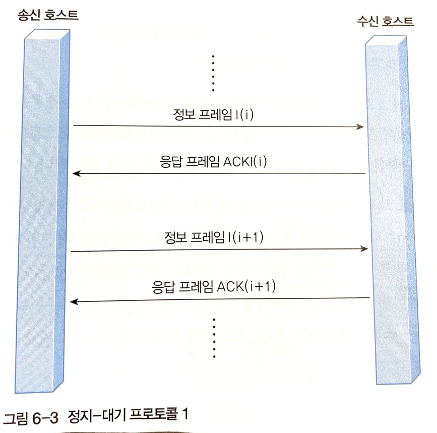 이처럼 각 정보 프레임에 대하여 수신 호스트가 회신하는 ACK 프레임이 도착해야 다음 프레임을 전송할 수 있는 프로토콜 방식을 정지-대기(stop-and-wait) 방식이라한다.(효율이 떨어져 사용 안 함)