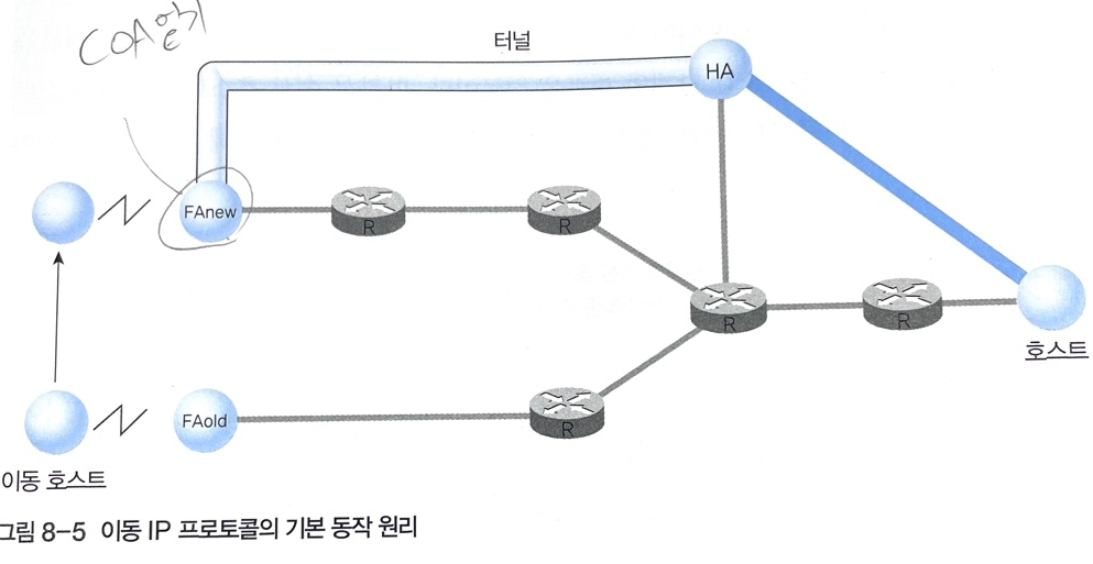 - 무선 호스트가 이동할 때 발생하는 데이터 경로 문제를 해결하기 위한 이동 IP 프로토콜로 먼저 이동 호스트의 위치가 바뀌면 새로운 위치를 관장하는 포린 에이전트(FAnew)로부터 COA(Care of Address)를 얻는다. 이 주소는 이동 호스트의 홈 에이전트 HA에 등록되어 FAnew와 HA 사이에 터널을 형성하는 데 사용된다. HA로 라우팅 된 패킷을 이동 호스트에 전달하려면 새로 형성된 터널을 통해 FAnew로 전달해야 한다.