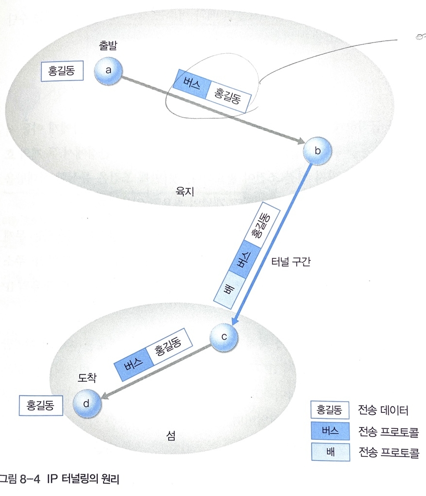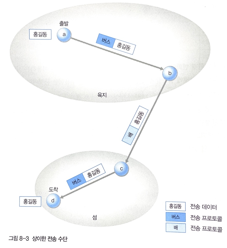 -> 홍길동이 (a)->(d)로 가며 (b), (c)를 거친다. IP 프로토콜을 이용하며 버스, 배만 바뀔 뿐 홍길동은 같다.