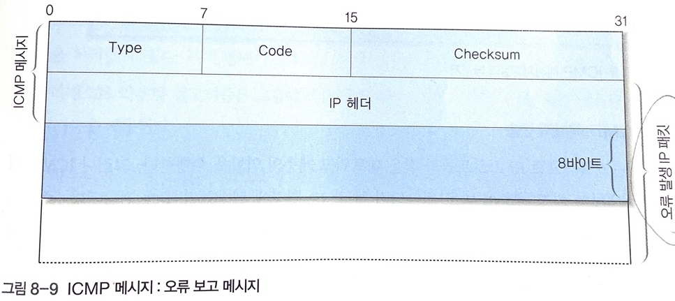 오류보고 메시지(Error-Reporting Message) - IP 패킷을 전송하는 과정에서 발생하는 문제를 보고하는 것이 목적이며 IP 패킷을 전송한 송신 호스트에 전달(ICMP는 오류 발생 사실을 통보하는 것 오류 해결을 상위 계층의 몫)