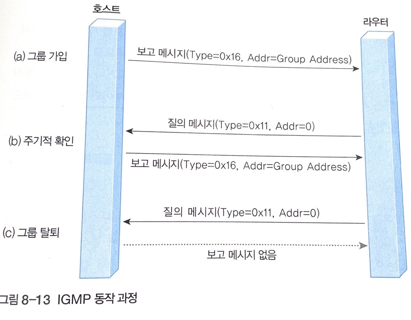 - 멀티캐스트 라우터가 그룹에 속한 멤버 목록을 유효하게 관리하려면 IGMP 질의 메시지를 사용해 주기적으로 확인하는 과정이 필요