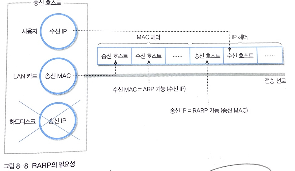 - 디스크가 존재하지 않는 시스템이나 X 윈도우 터미널 등에서는 자신의 LAN 카드 정보를 읽어 MAC 주소를 얻을 수 있지만 , 파일 시스템이 없으므로 IP 주소를 보관할 방법이 없다. 이런 경우 자신의 MAC 주소와 IP 주소의 매핑 값을 보관하는 서버 호스트로부터 IP 주소를 얻어야 한다.