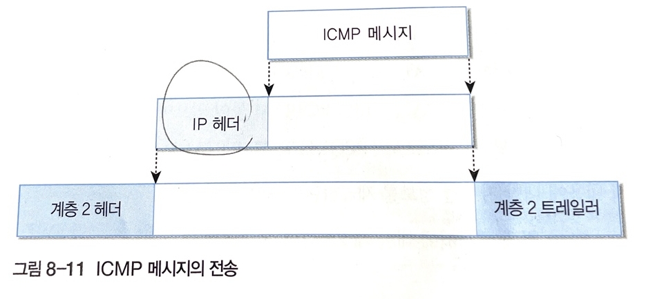 - ICMP는 기능적으로 IP 프로토콜과 같은 네트워크 계층의 역할을 수행하지만 2 계층에 바로 전달되지 않고, IP 패킷에 캡슐화된 후에 전달된다