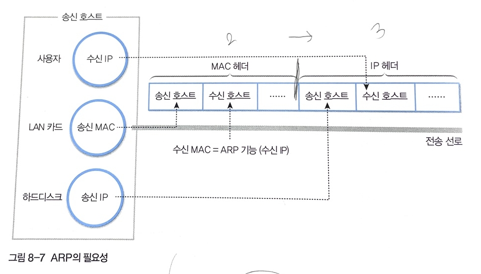 - 네트워크 환경에서 임의의 호스트가 다른 호스트에 데이터를 전송하려면 수신 호스트의 IP 주소뿐 아니라, MAC 주소도 알아야 한다. 수신 호스트의 IP 주소는 보통 응용 프로그램 사용자가 프로그램을 실행하는 과정에서 직접 입력하므로 IP주소로부터 수신 호스트의 MAC 주소를 얻는 작업이 추가로 필요.