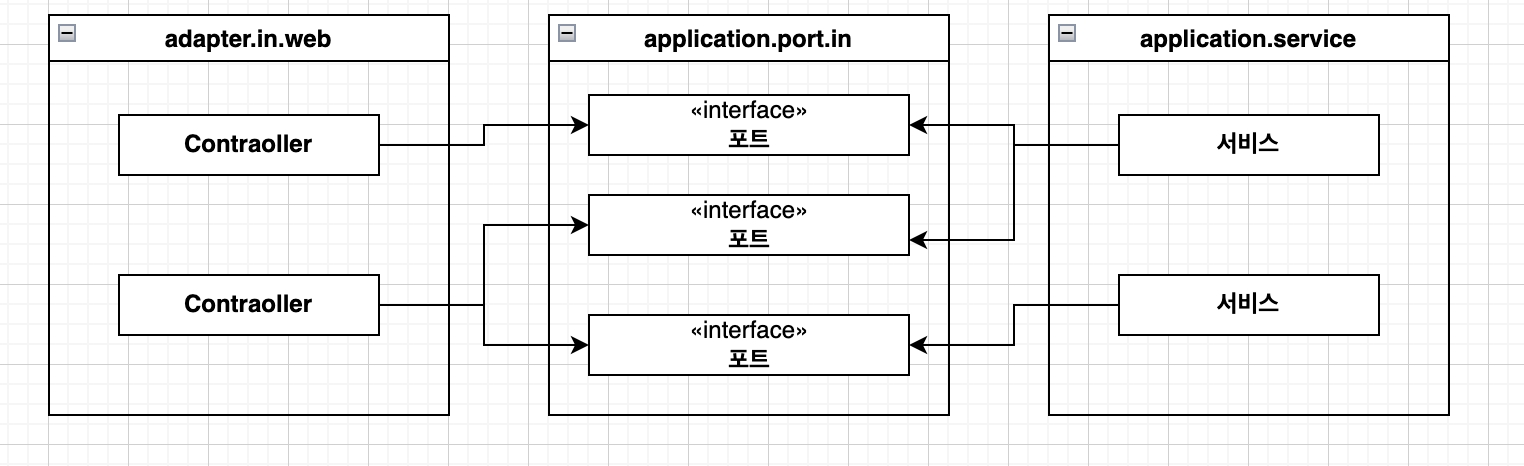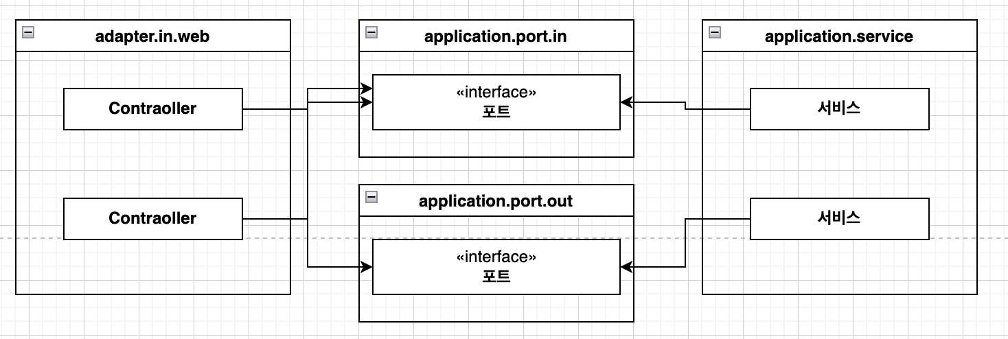 애플리케이션 계층은 웹 어댑터가 통신할 수 있는 특정 포트를 제공하고, 서비스는 이 포트를 구현하고, 웹 어댑터는 이 포트를 호출할 수 있다.