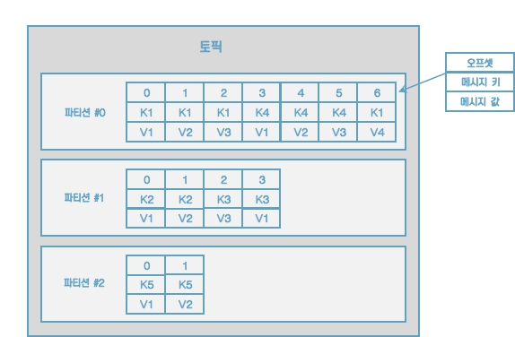 메시지 키와 메시지 값을 함께 전송한 레코드는 토픽의 파티션에 저장된다. 메시지 키가 null인 경우에는 프로듀서가 피티션으로 전송할 때 레코드 배치 단위로 라운드로빈으로 전송한다. 메시지 키가 존재하는 경우에는 키의 해시값을 작성하여 존재하는 파티션 중 한 개에 할당된다. 이로 인해 메시지 키가 동일한 경우에는 동일한 파티션으로 전송된다.